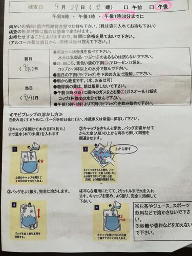 先日経緯を書きました、大腸内視鏡検査受けてきました。 gogo-kosodate.hatenablog.com 検査前日 まずは検査の流れを確認。 大腸内視鏡検査専用食を朝から食べます。 開封してみましたが、足りなそう…(´;ω;`) 気を取り直して朝ごはん。親子丼風おじや250g…